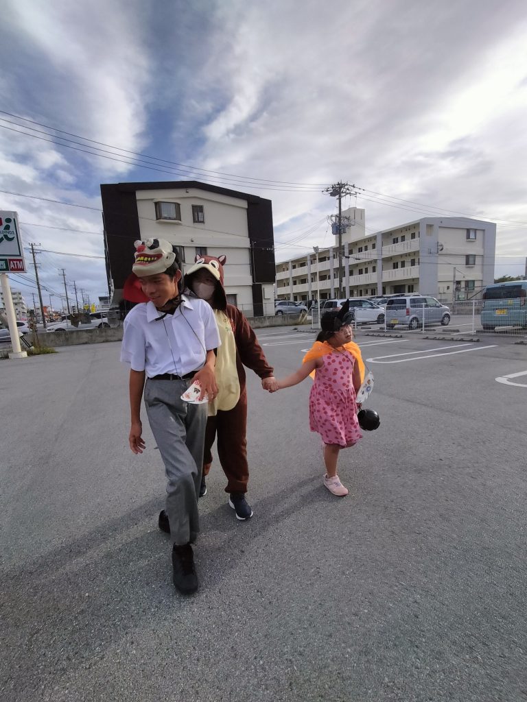 こんにちは。まはろ伊良波スタッフです! さて今日の課題は1日早いハロウィンパーティーをしました。 好きな仮装をして、近所のセブンイレブンさんと豊見城モータースさんにお菓子を貰いにいきました✨ トリックオアトリートの合言葉を言って、たくさんお菓子を貰い、嬉しそうでした✨ また来年のハロウィンが楽しみですね! 明日の課題もお楽しみに👋 【児童デイサービスまはろ伊良波】 TEL098-996-2971