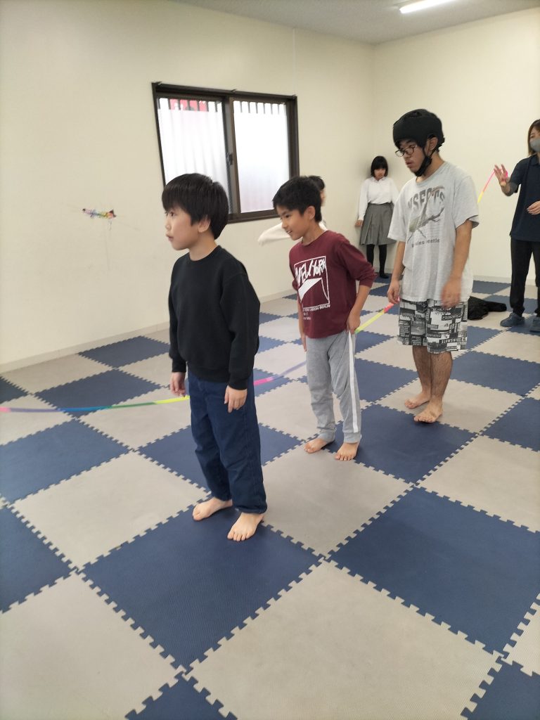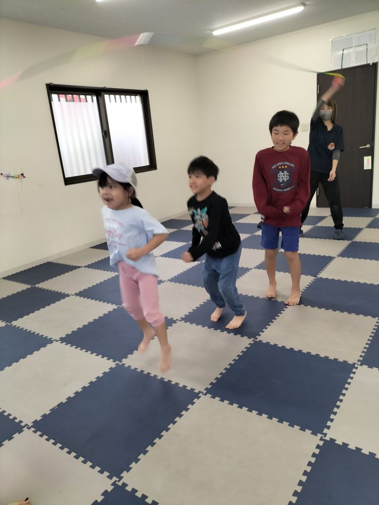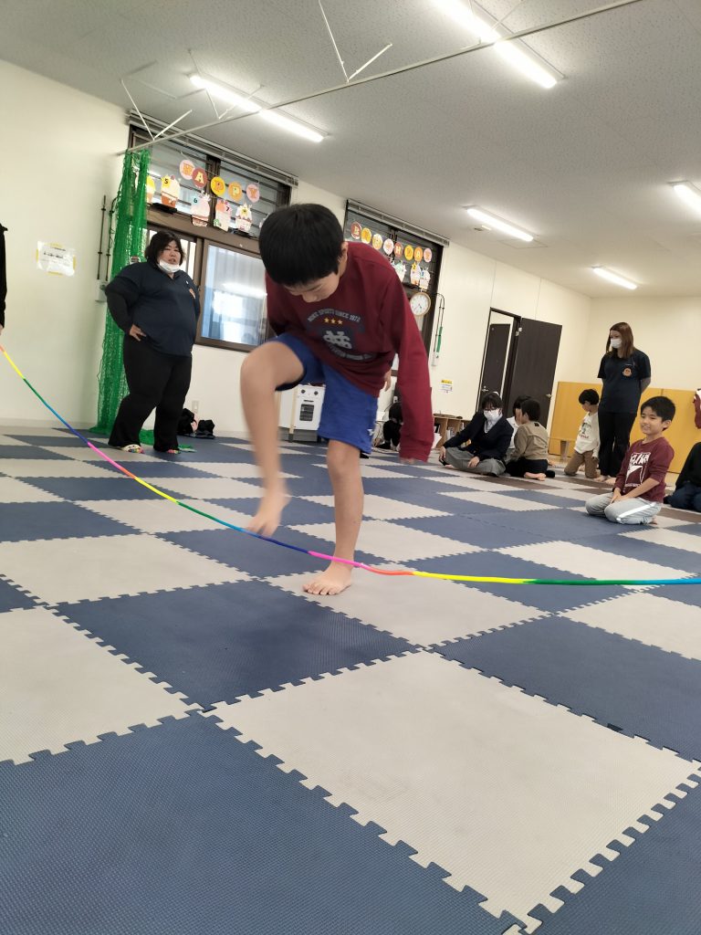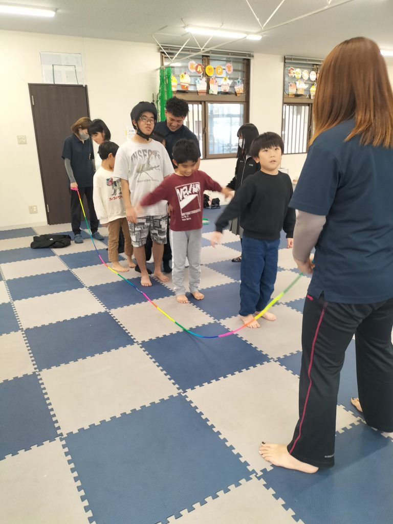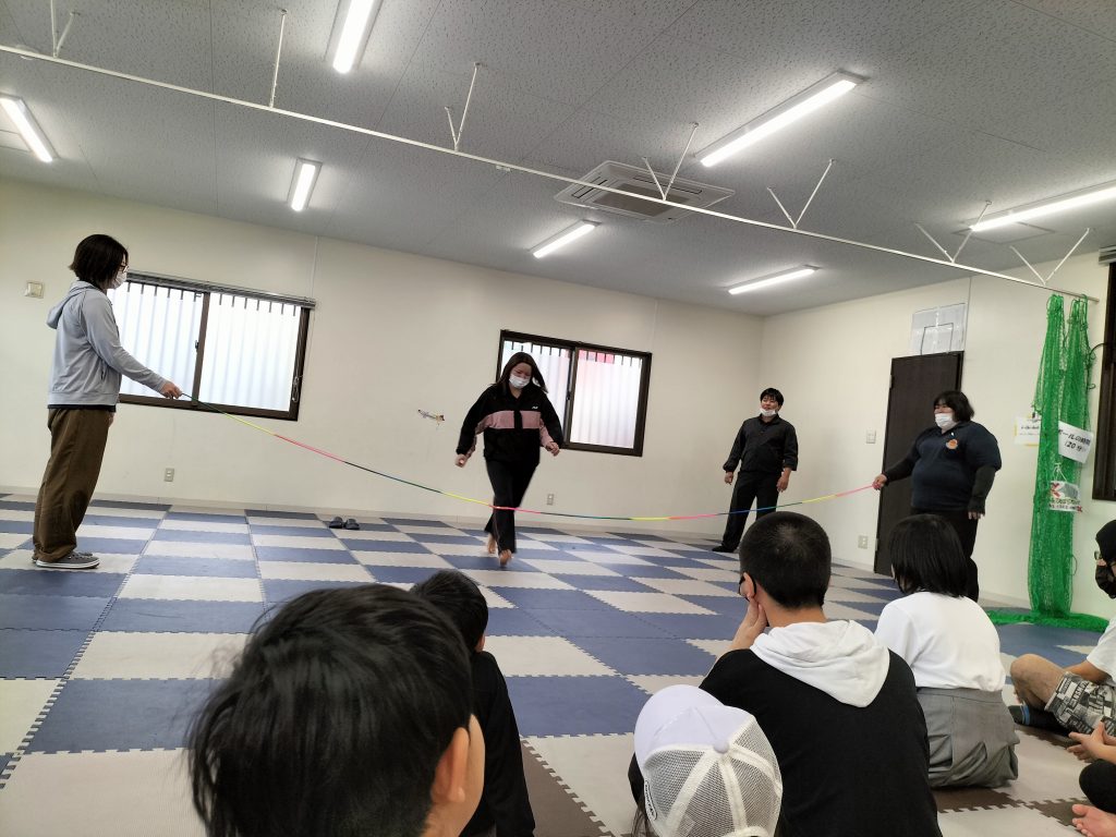 こんにちは☺まはろ伊良波スタッフです。 今日の課題は【大縄跳び】です。 まずはスタッフがお手本を披露します まずは低い位置から縄をとび越える練習をしました。 そのあとは三人ずつのグループに分かれて、縄を回して跳んでみました! みんなで楽しく跳ぶことができました。 またやろうね✨ 明日の課題もお楽しみに。