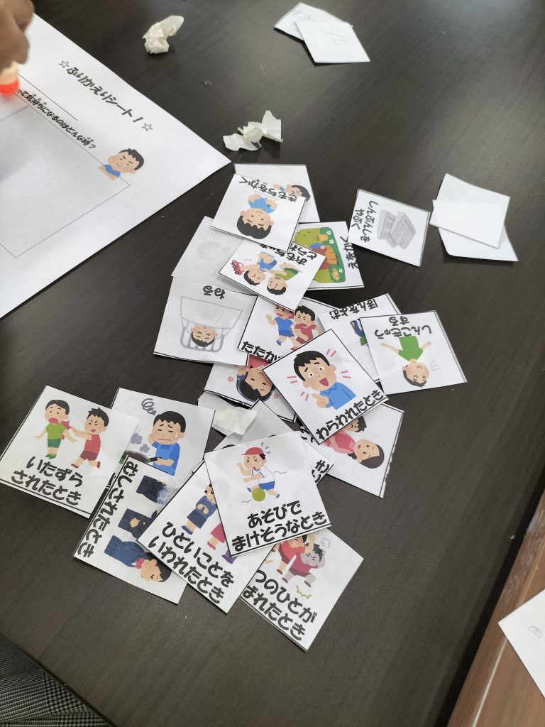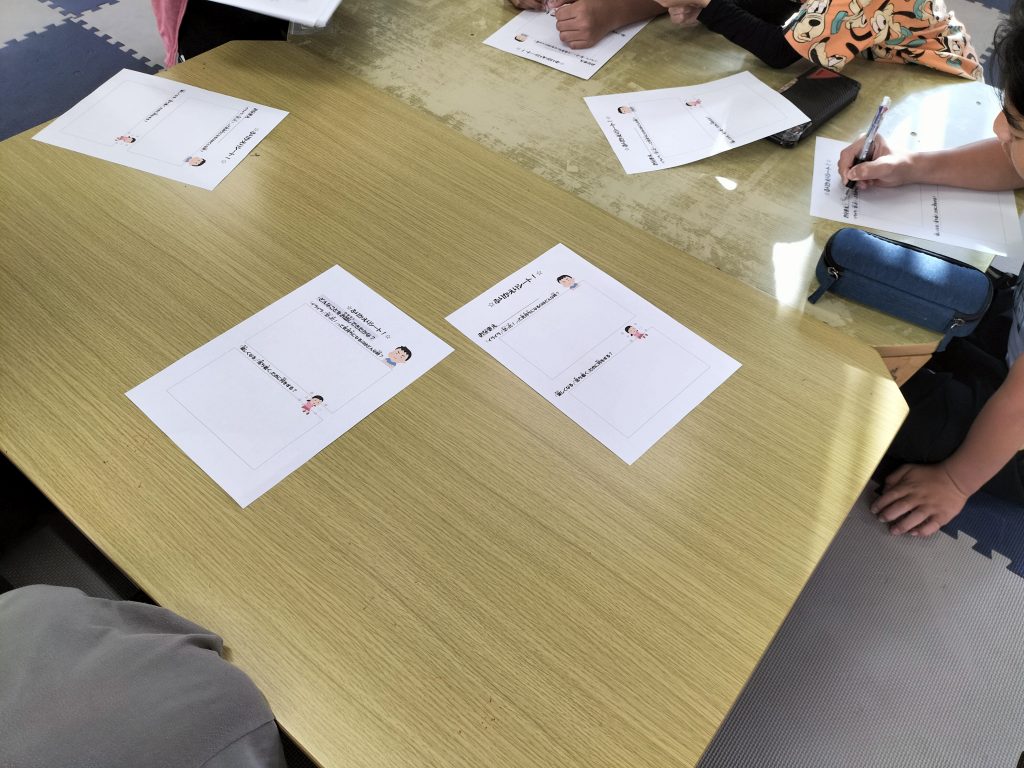 こんにちは、まはろ伊良波店のスタッフです\(^o^)/ 今日もとてもいい天気になりましたね♫ さて、今日の課題はSSTで感情のコントロールの仕方を学びました! スタッフが分かりやすくレモンストレーションを行い、それを見て子ども達にどう思ったかを聞いています。 お友達が気持ちの切り替えに困った時に、 どんなふうに声をかけたらいいのか皆で考えることができました✨ その後は、1人ずつ振り返りシートに 自分のイライラする時、気持ちを落ち着かせる方法を書いてます。
