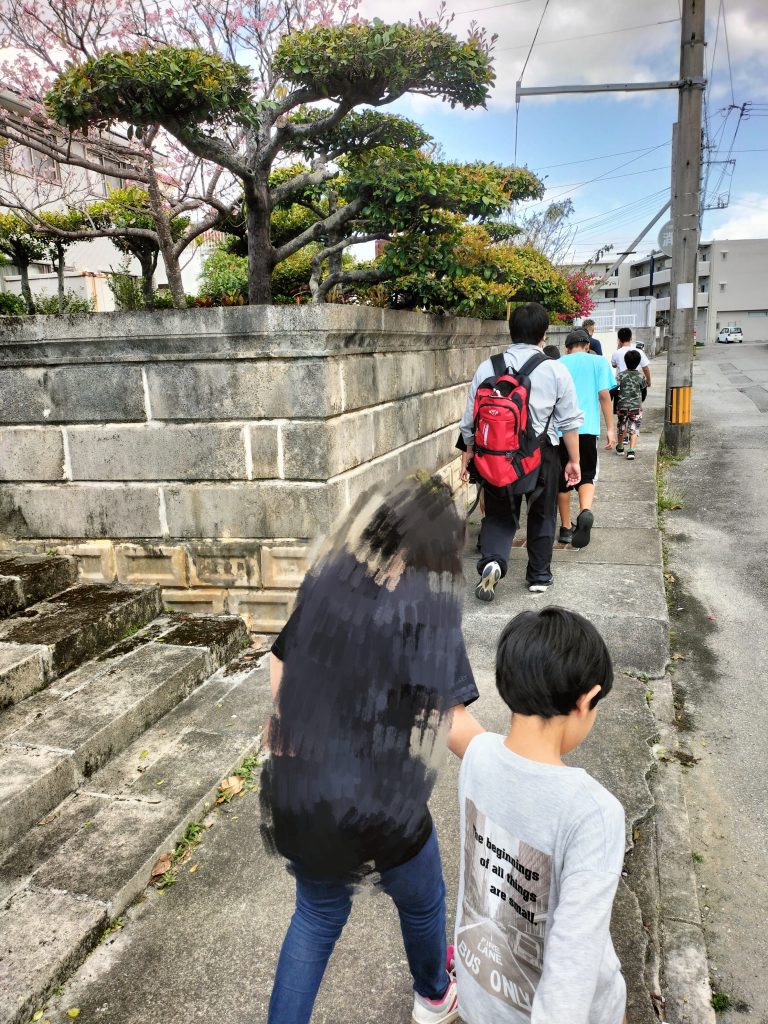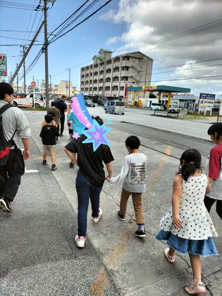 避難指定場所の伊良波小学校目指して歩きます。道中は安全に気をつけながらね😊