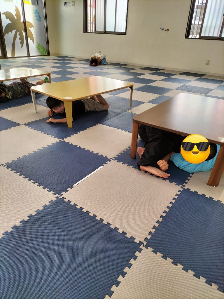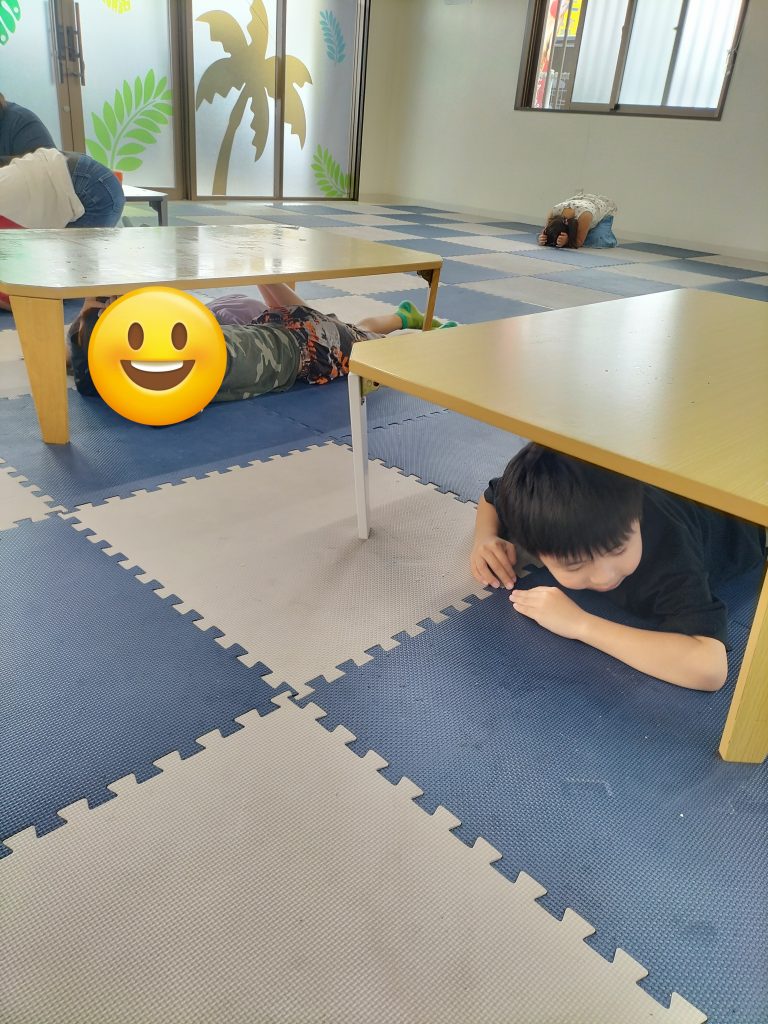「地震だ!」の声に反応してテーブル下にもぐりだんご虫ポーズで自分の身を守る練習をしました。